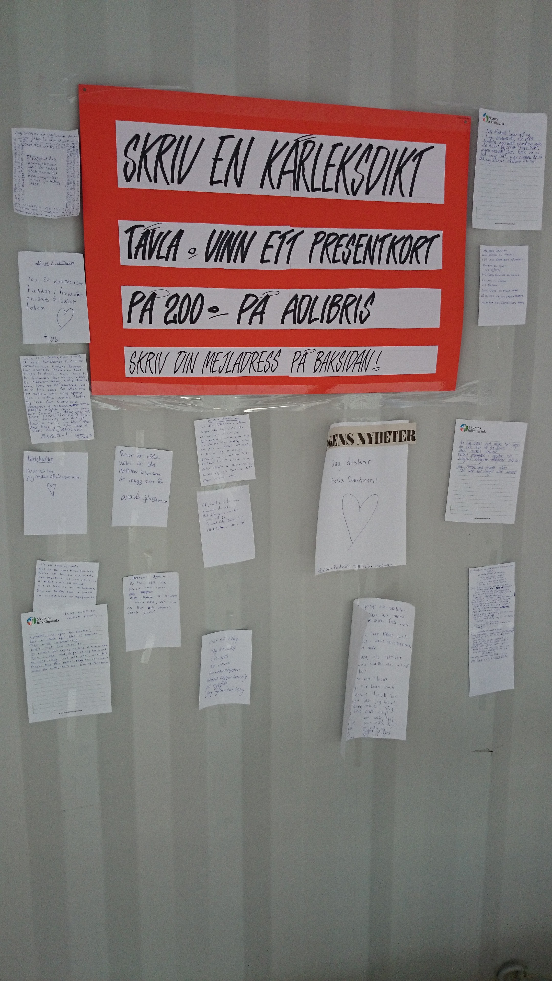 Det var kort sagt en fantastisk dag och det var jättekul att prata med alla skrivglada människor! Alldeles speciellt kommer jag att minnas mannen i 60-årsåldern som kom in till oss på kvällskvisten och ville skriva en kärleksdikt till sin fru. När han var klar visade han sitt alster för mig och jag satte upp dikten på väggen. Men en halvtimme senare kom han tillbaka. Han hade då talat med sin fru på telefon och hon ville gärna se dikten. Såklart. Han gick med ett stort leende på läpparna och dikten i handen från vår container. Och jag log åt skrivandets magi. Vi är många som blir lyckliga av att skriva. Jag kan förresten sätta en slant på att frun också blev lycklig, när hon fick läsa kärleksdikten!