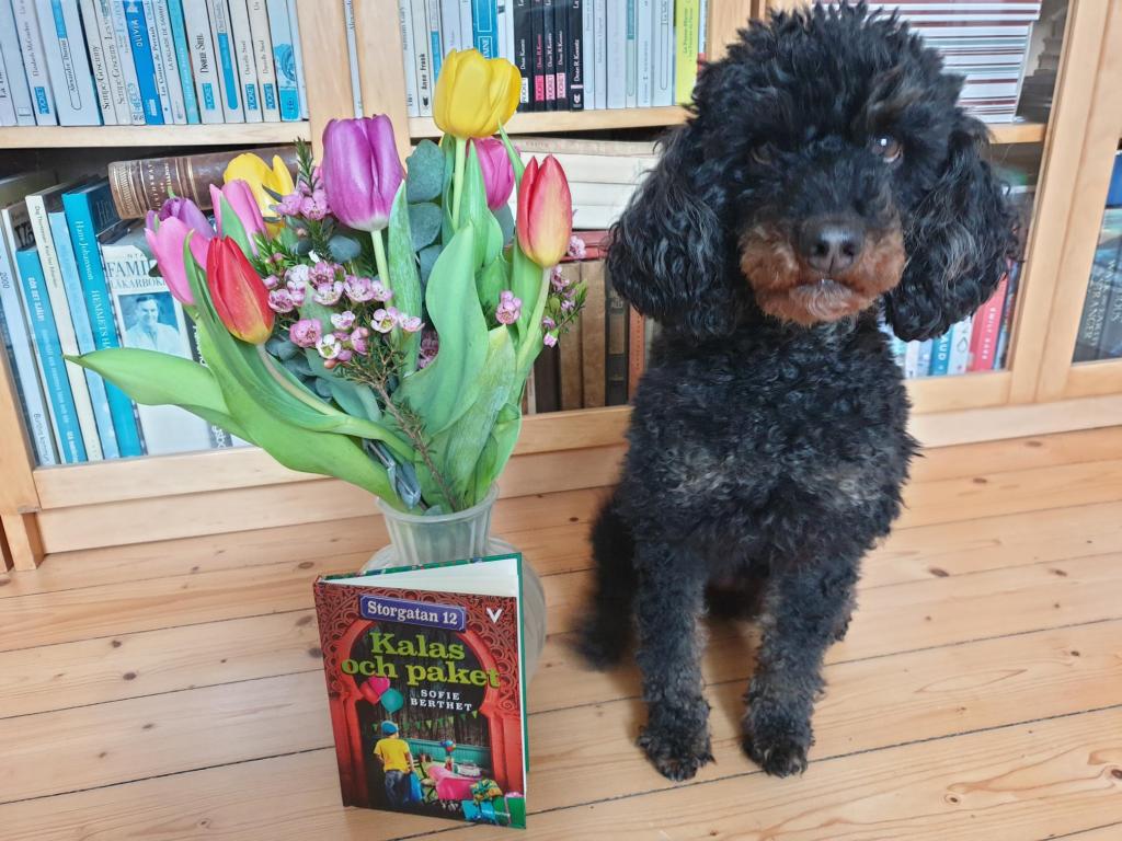 Och ja, som ni ser fick skrivarhunden Malia vara med även när Kalas och paket skulle fotas. Hon ligger oftast i mitt knä när jag skriver, så det är inte mer än rätt att hon får vara med på bild när boken är klar …